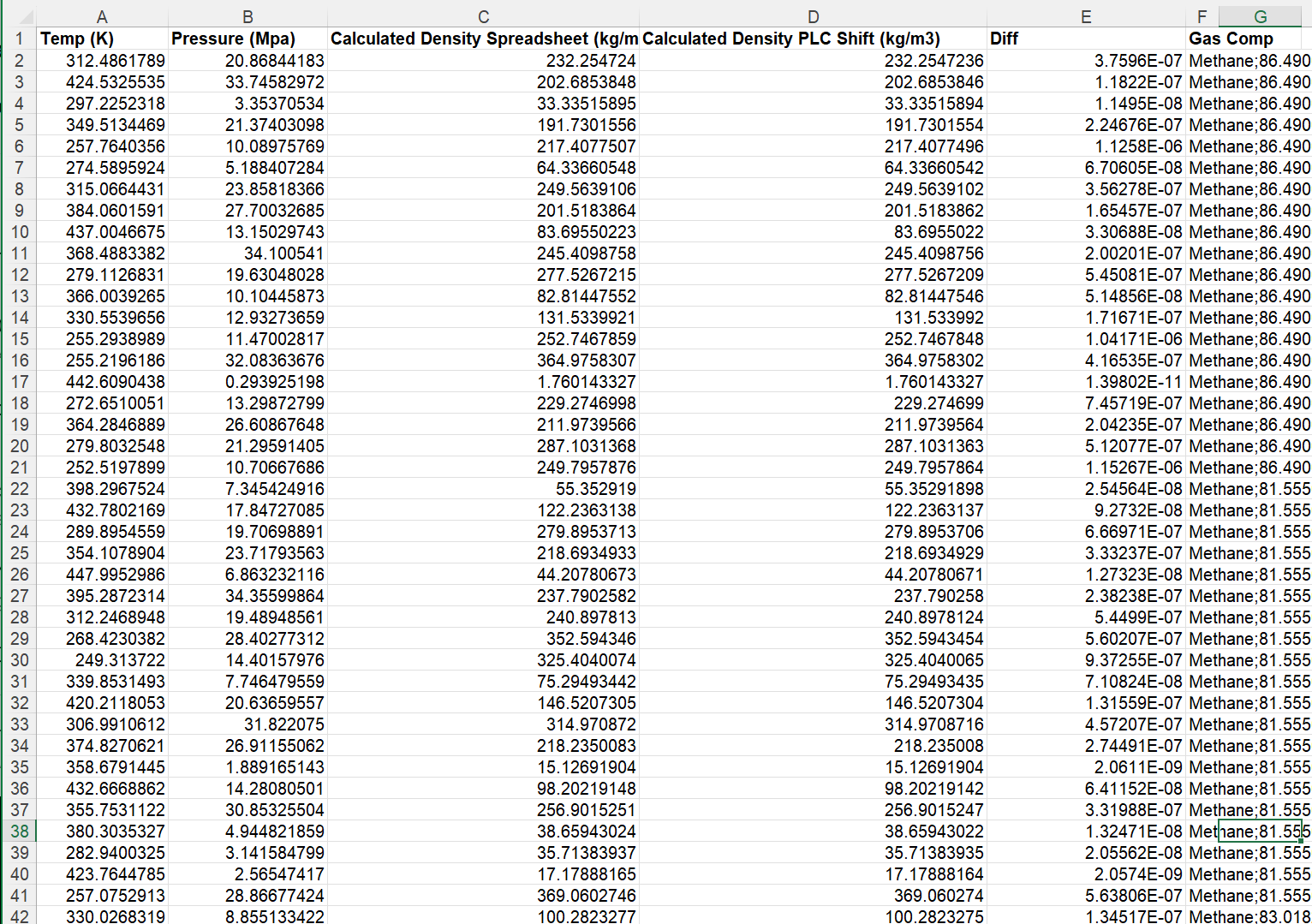 The spreadsheet only contains 10 000 test cases, but we have run this test many times and see that the PLC Shift results consistently match up with the reference implementation. We are confident in the accuracy of our implementation of the AGA8 2017 Part 2 (GERG) calculation.