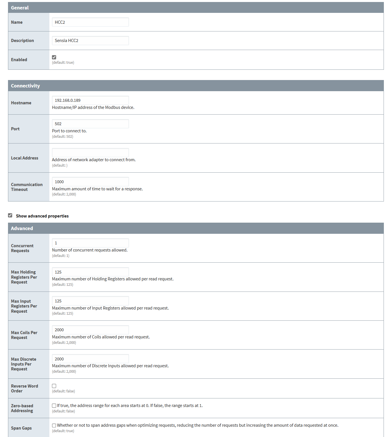 In Ignition, set up a Modbus server using the Config->OPC-UA->Device Connections option while connected to the gateway using a browser. The default settings with respect byte and word ordering match the defaults in PLC Shift, so no changes need to be made here. Ignition's Modbus driver is very aggressive when it comes to register spanning, however, and we have seen cases where turning the 'Span Gaps' option off is necessary for stable communications. The Sensa HCC2 in particular benefits from having this setting disabled.