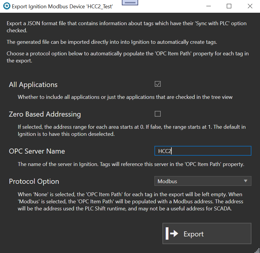Generate an Ignition export using the File->Export->Inductive Automation option in PLC Shift Manager. This option is only enabled when you have a device selected in the tree view. As of PLC Shift Manager version 1.45 (August 2024), only 'Modbus' is supported in the 'Protocol Option' field. Choosing another option here will result in an error. This will create a JSON file that contains tag definitions. Each tag will have a Modbus address configured.