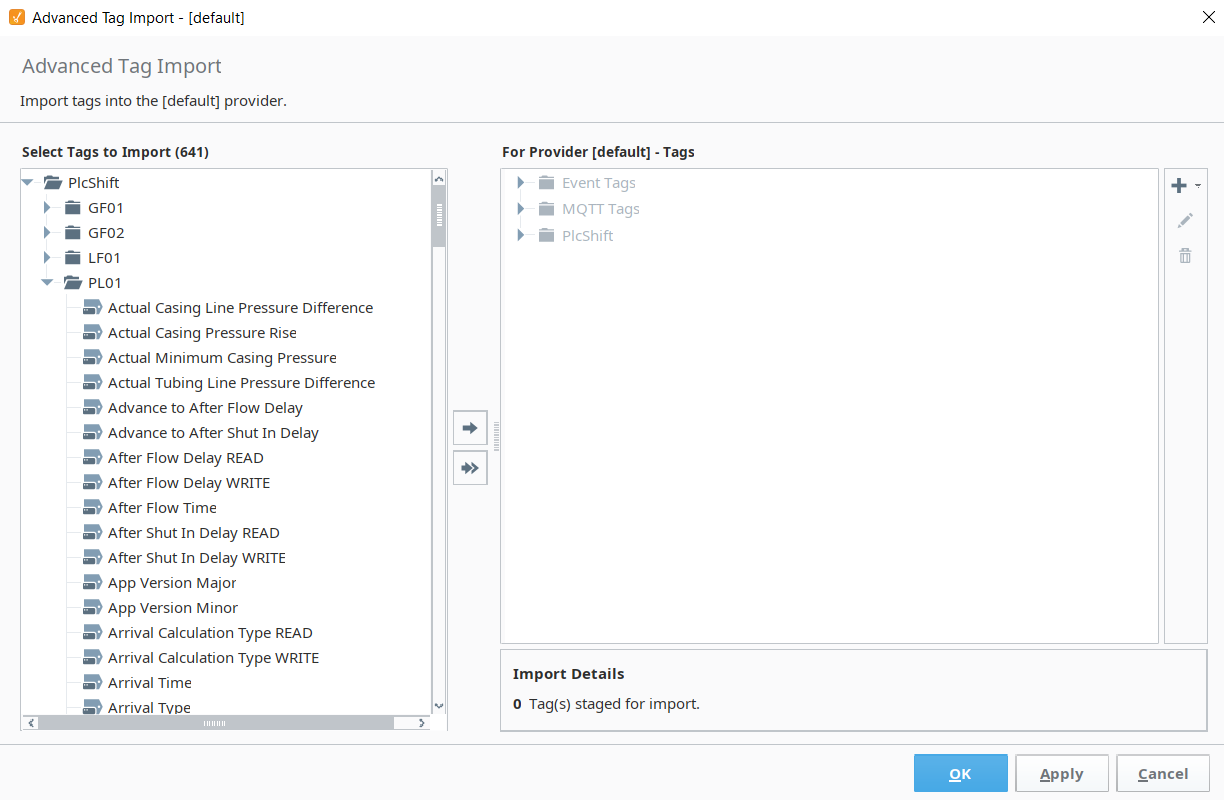 Import the JSON file into the tag browser Ignition Designer. Tags for each app will be grouped into their own folder, and all app folders will be created under a top level folder called 'PLC Shift'. The script that generates the data set relies on this specific hierarchy.