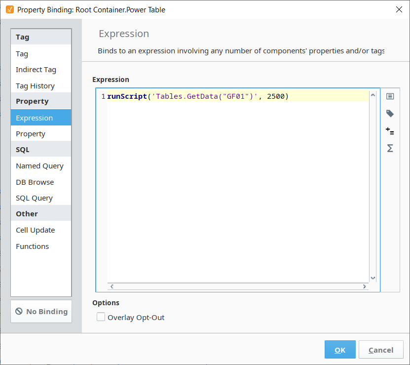 In the Expression editor, add an expression to call the GetData script with the app name. The example shows that the script is called every 2500 ms.