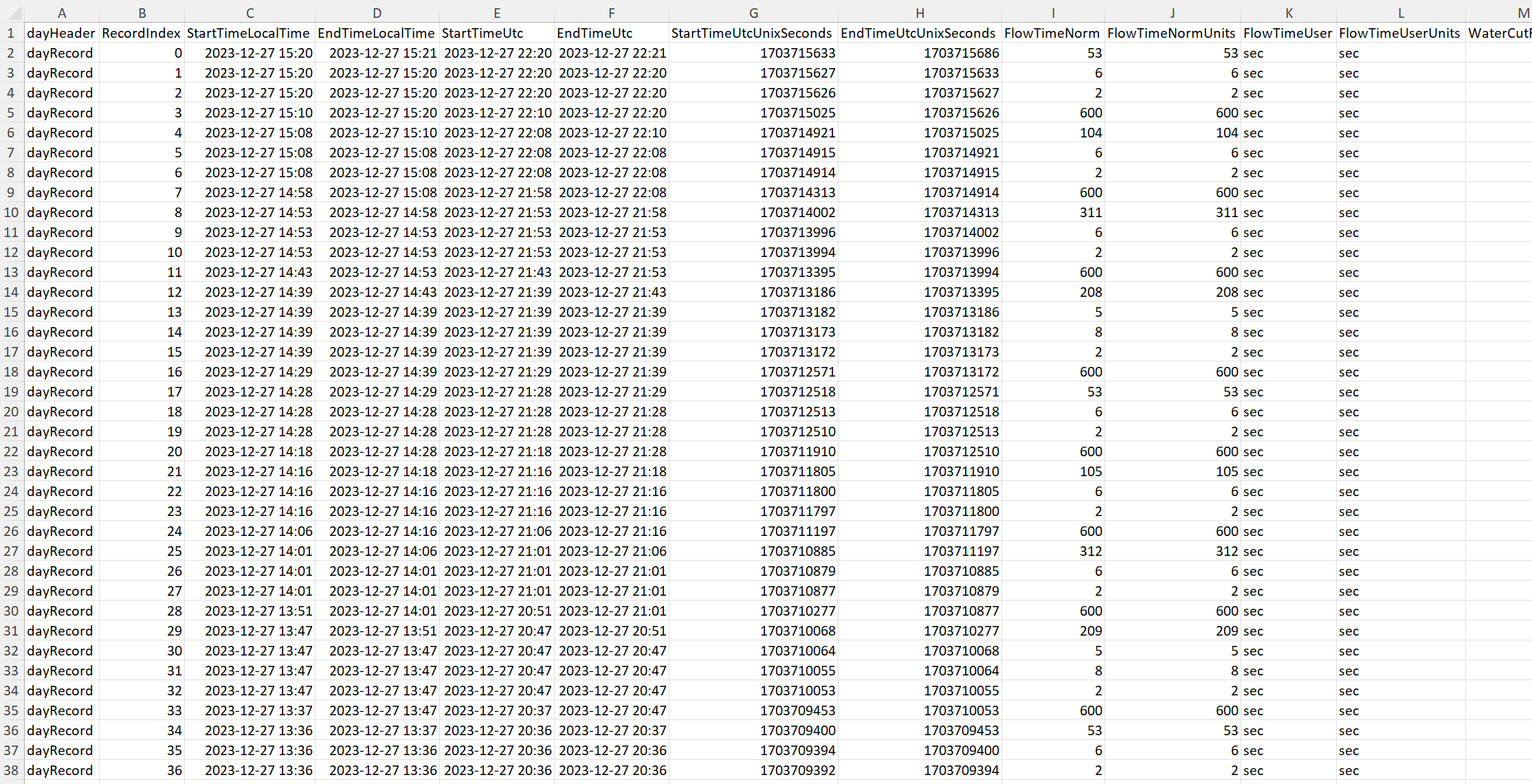 History Export Excel Format, Version 1.1 and Earlier
