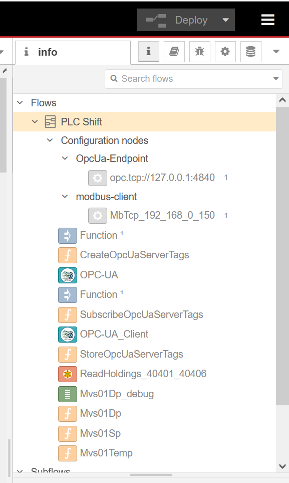 In PLC Shift Manager, at the Device level, a new 'Node Red' tab has been added. This can be seen in the PLC Shift Manager screen grab at the top of this page. This tab contains a tree view that is the heart of the Node Red system.