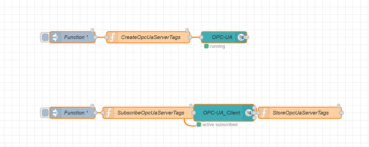 A function node that actually creates the tags in the OPC UA server. This function is called once when the associated inject node fires. This function must not be called before the OPC UA server is running.