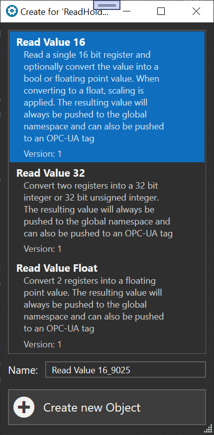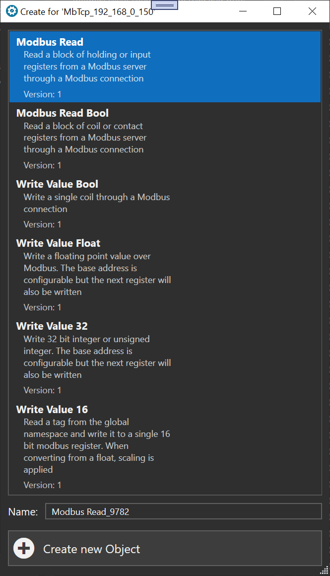 Select this option to create a child object under the currently selected object. When selected, a new window will open that allows you to select the type of object to create. Objects will be created with a random name, but the name can be changed later on. Note that all object names must be unique across the system, and that for some types of objects, like Modbus read values, the object name is also the name of the tag that the value is stored under in the global context.