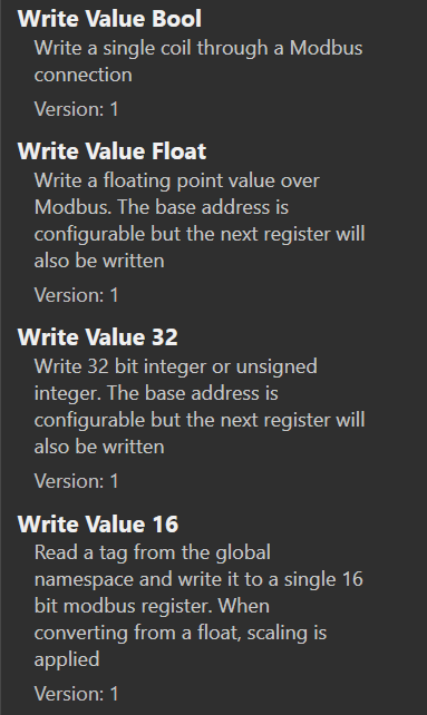 Modbus write objects are direct children of the Modbus connection object. Select the type of object based on the Modbus value type that you want to write. Depending on the object type, options are available to scale values, apply an offset, and so on.