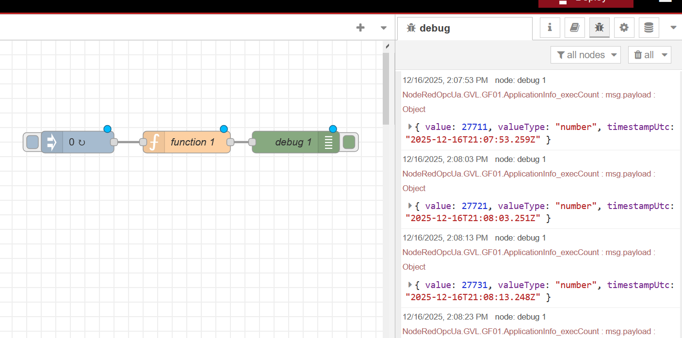 The screen grab below shows reading the 'NodeRedOpcUa.GVL.GF01.ApplicationInfo_execCount' tag from a gas flow app once every 10 seconds. The gas flow app is running and connected to Node Red over OPC UA. It writes a new value for the execution count every second.