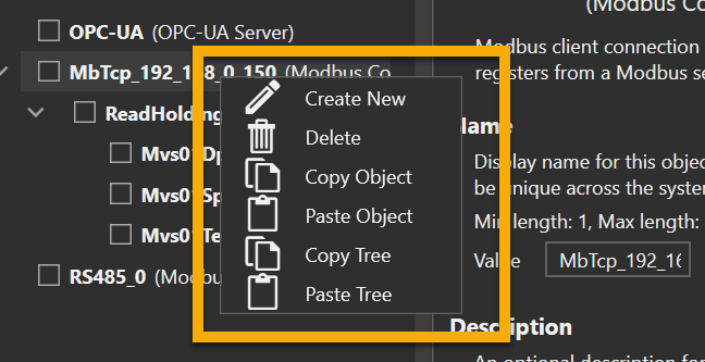 Each type of object in the tree view can only have children of a specific type. For example, a 'Modbus Connection' object can only have a Modbus read or write objects as children. In the same way, a 'Modbus Connection' object can only be created directly under the system root, and cannot be created as the child of any other object type.