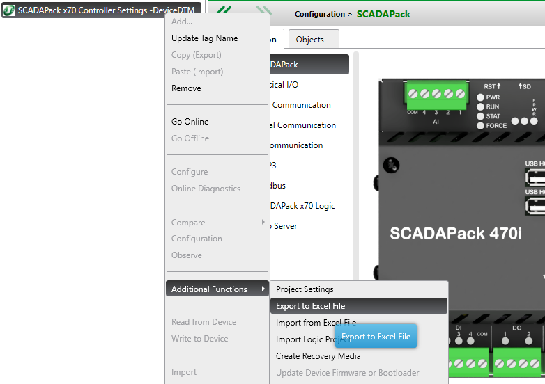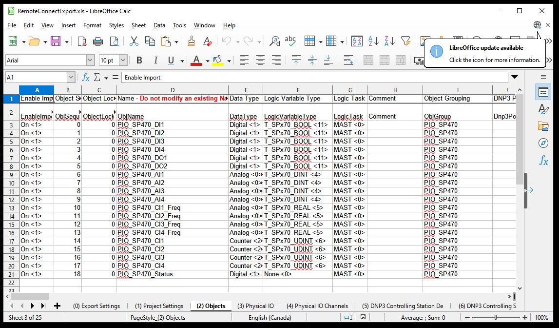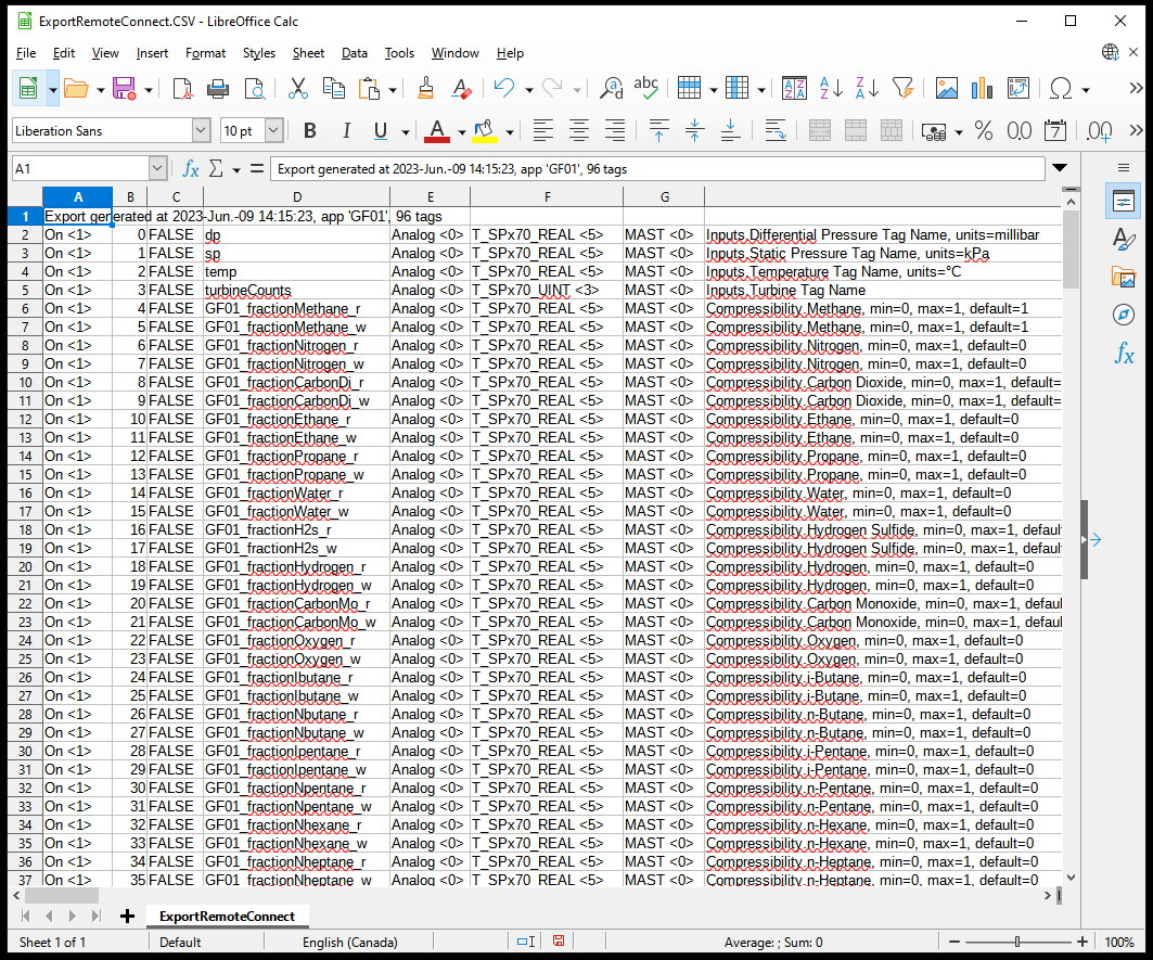 Generate a CSV file using the 'File->Export->Remote Connnect' feature that contains objects that are suitable for import into Schneider Electric Remote Connect software. Each line will contain information for one object. All objects for all applications will be exported in the same file.
