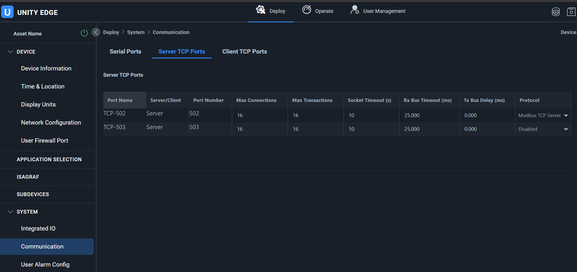 In Unity Edge, in the Deploy->System->Communication menu, enable one of the Modbus TCP servers. Note which server you have enabled and which port it is using. Internal to the HCC2, port 502 is mapped to port 25002 and port 503 is mapped to port 25003. The value that you enter in device's configuration in PLC Shift Manager is the internal port number.
