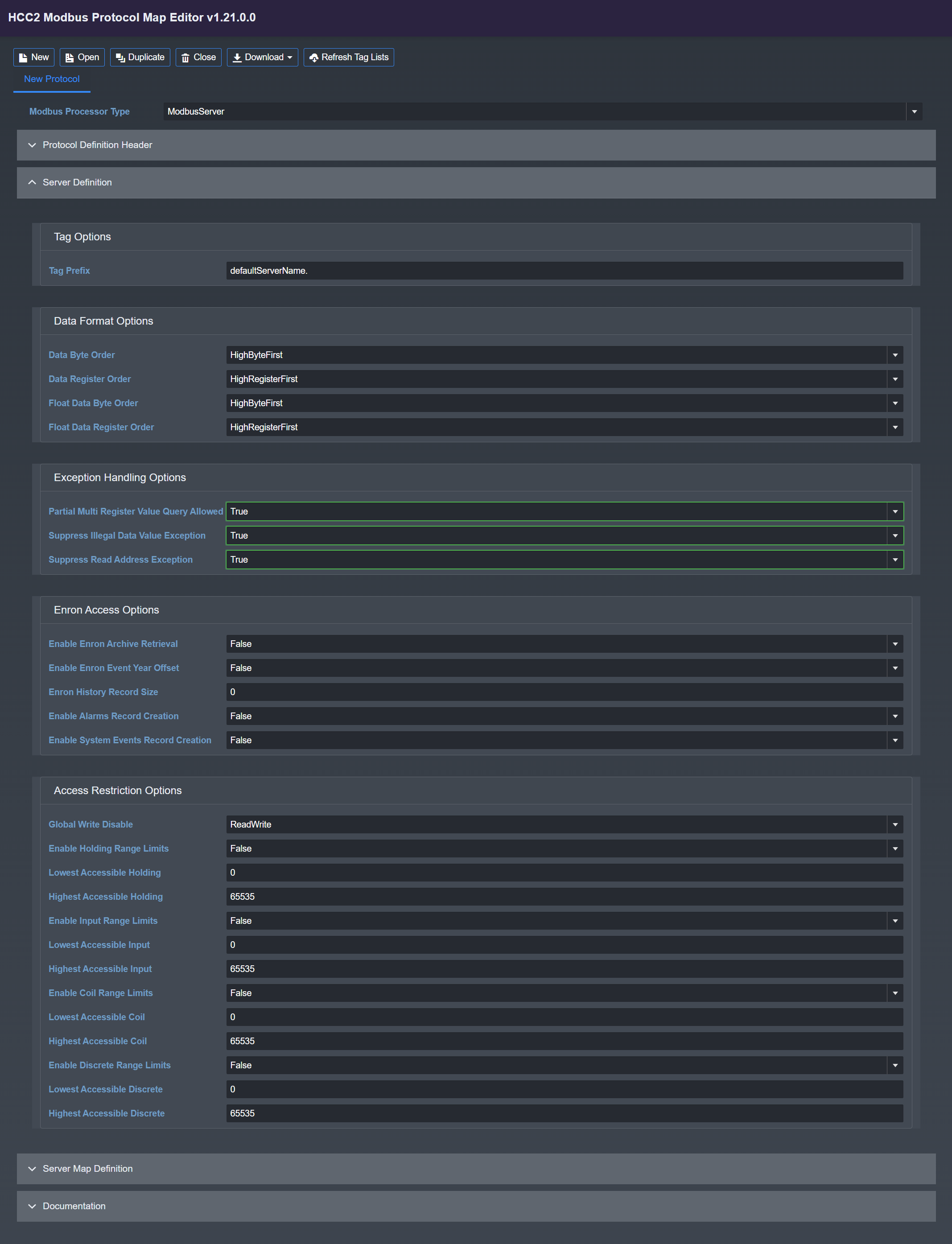 2. Open the Modbus map editor and configure the 'Protocol Definition Header' and 'Server Definition' sections. The header section is purely for documentation and has no effect on operation. In the 'Server Definition' section, the default data format options (byte and register ordering) match the defaults in PLC Shift, so no changes are necessary.