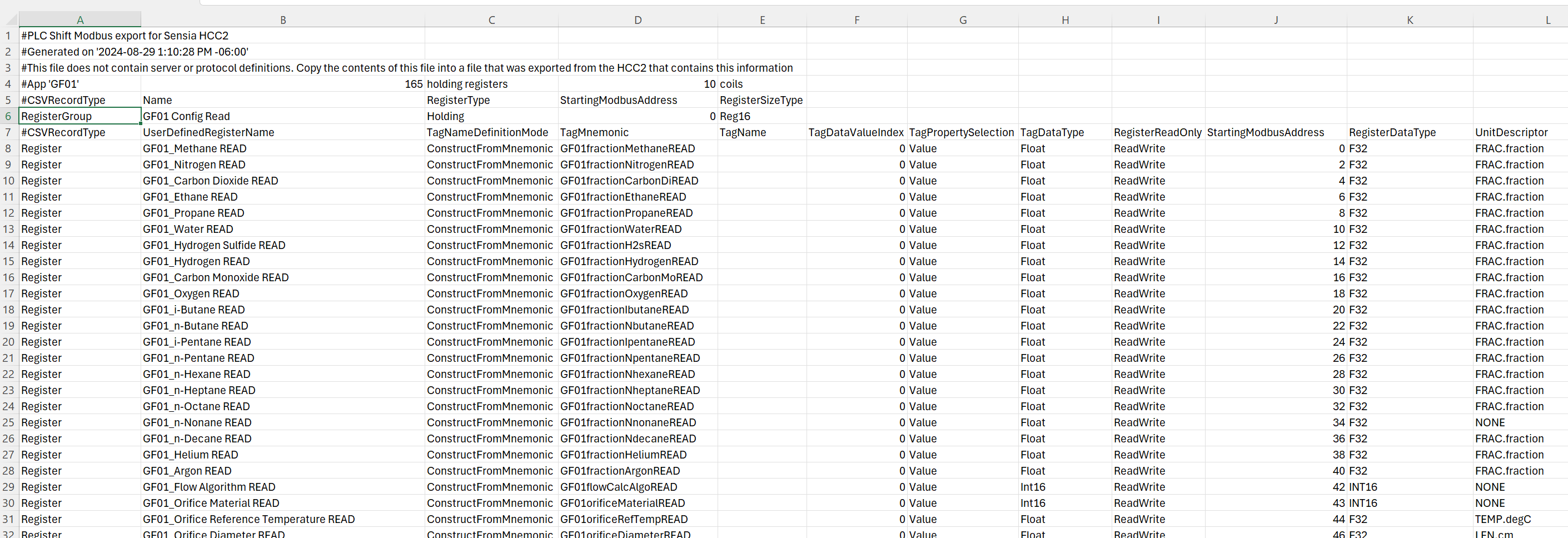 The PLC Shift runtime connects to the HCC2 using the Modbus TCP protocol. PLC Shift Manager has an export specific to the HCC2's Modbus map editor that allows you to quickly import tags and registers for multiple apps.